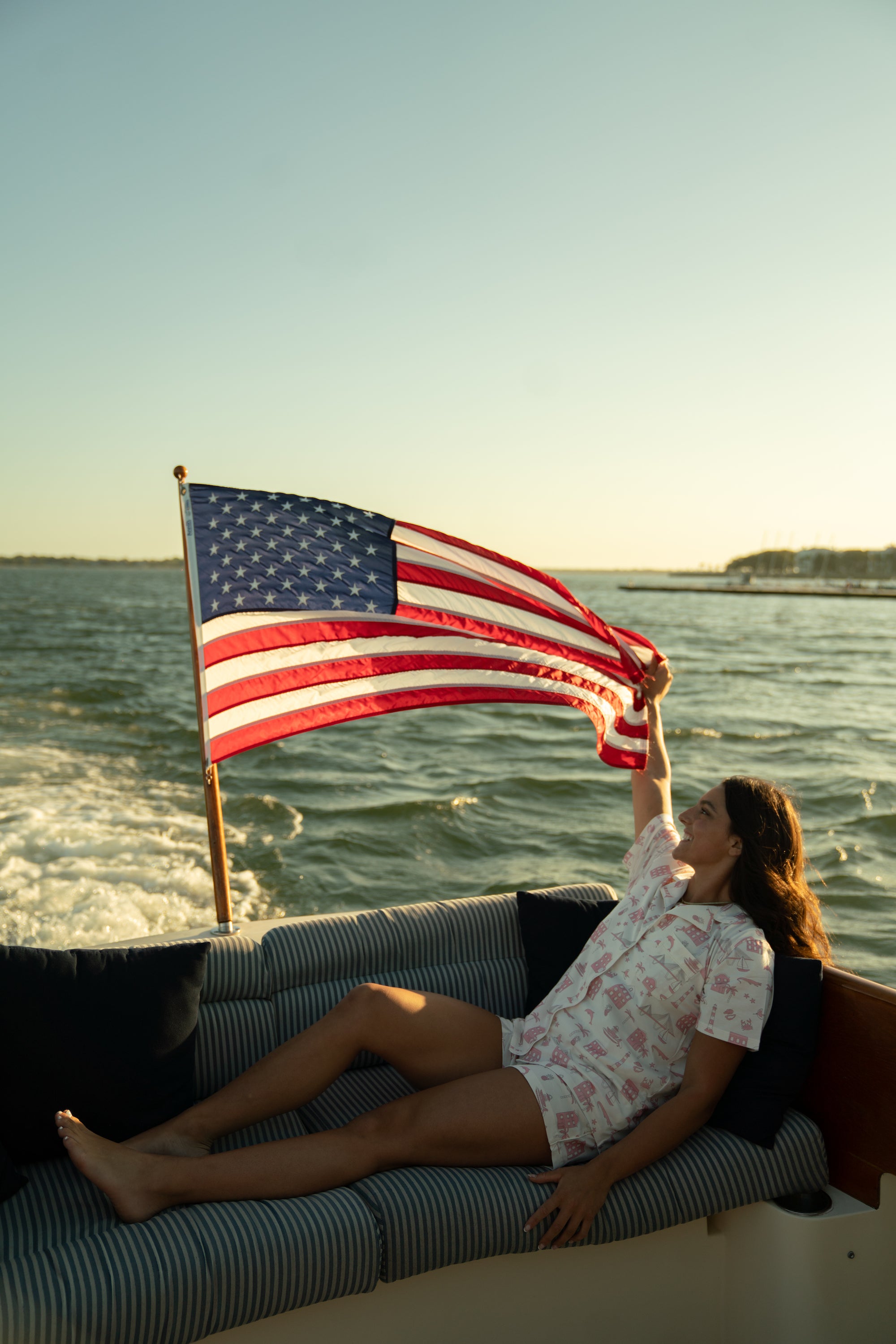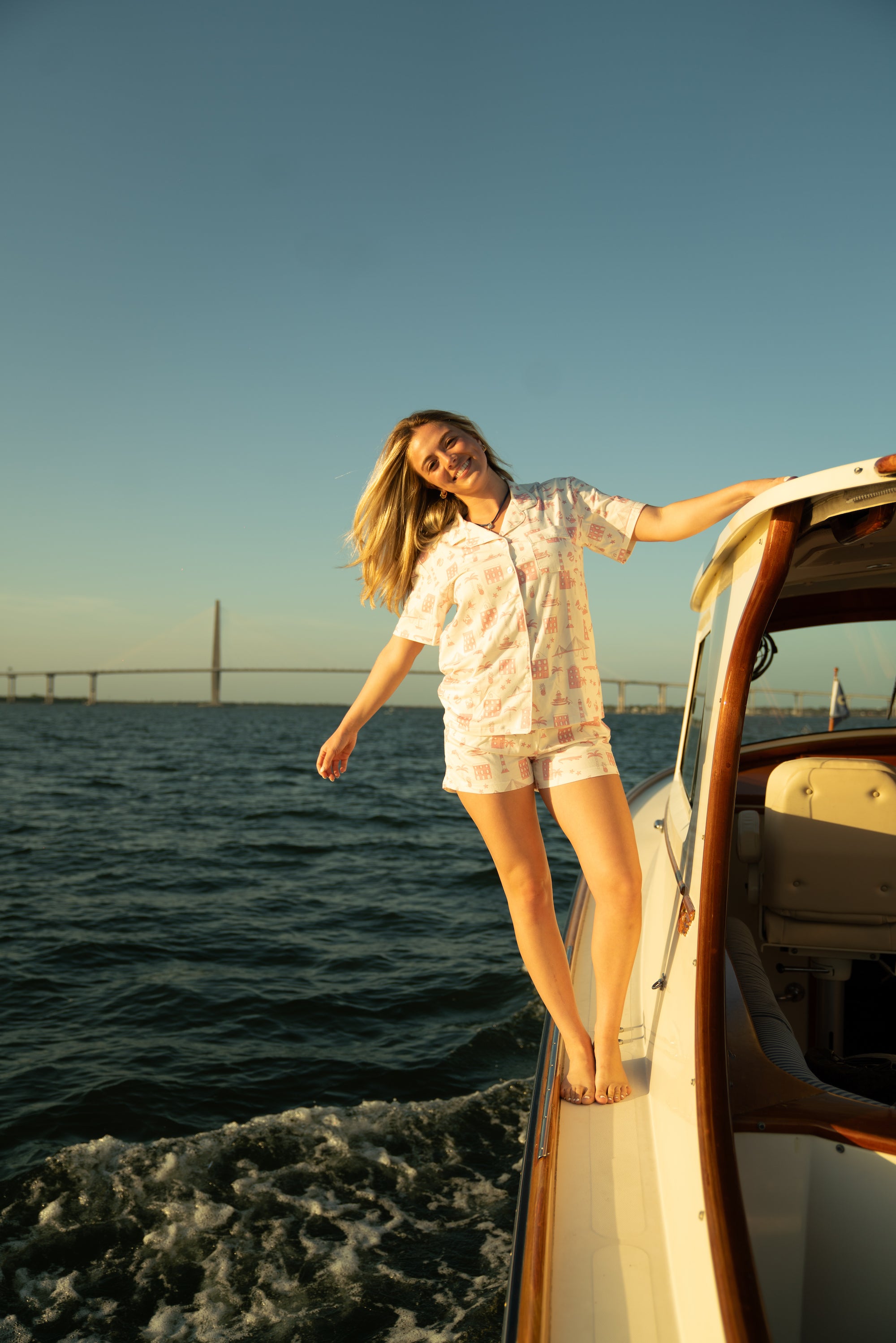 Drift off in charm and comfort with our Charleston pajama set! Featuring a playful print inspired by the pastel houses, iconic monuments and coastal vibes of Charleston, South Carolina. Because sleepwear should be just as cute as your daytime 'fits.