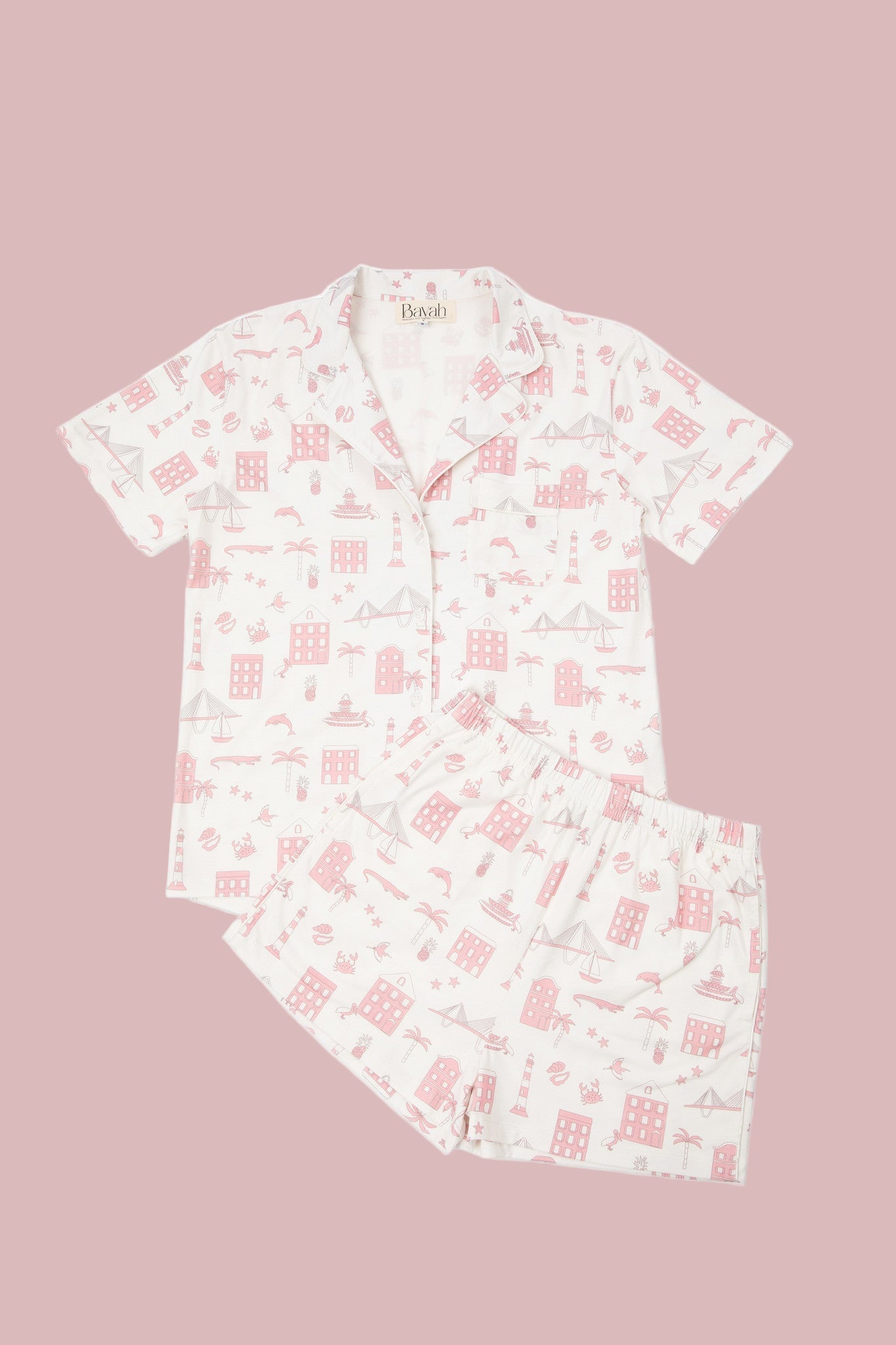 Drift off in charm and comfort with our Charleston pajama set! Featuring a playful print inspired by the pastel houses, iconic monuments and coastal vibes of Charleston, South Carolina. Because sleepwear should be just as cute as your daytime 'fits.